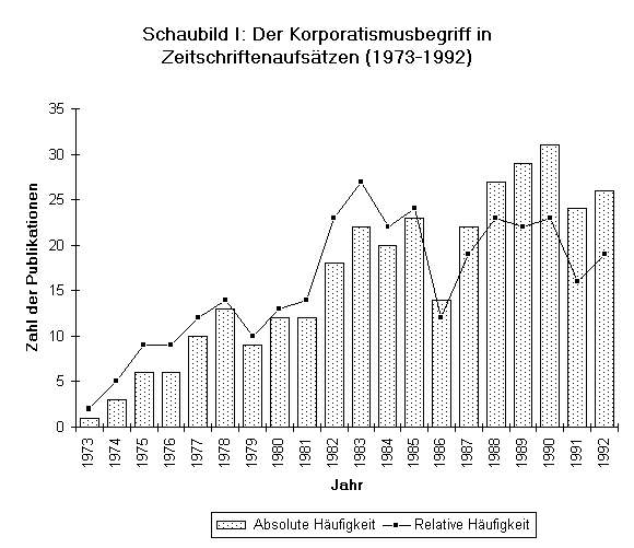 Es war 1974 als Philippe Schmitter und Gerhard Lehmbruch die Debatte in Gang brachten. Die Zahl der Zeitschriftenveröffentlichungen zur korporatistischen Interessenvermittlung ist seitdem zyklisch angewachsen und erreichte 1990 einen absoluten Höhepunkt (Schaubild I). Die Verwendung des Korporatismusbegriffes verläuft nach dem Muster der Verbreitung von Moden analog einer logistischen Wachstumskurve (S-Kurve). Tatsächlich wurde das Konzept zunächst auch als eine Modeerscheinung betrachtet. Da sich aber diese Begriffskonjunktur über nunmehr 20 Jahre hinweg entwickelt hat, kann sie mit dem Faktor Neuigkeitswert schwerlich erklärt werden.