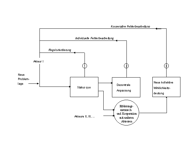 3. Kooperatives Lernen: Die dritte Möglichkeit besteht in der auf nichthierarchischem Wege koordinierten Anpassung an eine neue Problemlage. Allerdings setzt dies den (im Rahmen institutioneller Anreizstrukturen) freiwilligen Verzicht auf eigenständige Problemlösungsversuche jedes einzelnen Akteurs zugunsten der Herausbildung neuer kollektiver Situationsdeutungen und gemeinsamer Problemlösungen voraus. Der Vorteil liegt in einem angesichts der Umbruchsituation größtmöglichen Erhalt der Integrität des Akteursystems – mit allen Folgen für dessen künftige kollektive Handlungsfähigkeit, die damit verbunden sind. Diese Art der Problembearbeitung, die Regelanpassungen aufgrund veränderter Situationsdeutungen einschließt, könnte als kooperatives Lernen in Institutionen bezeichnet werden.